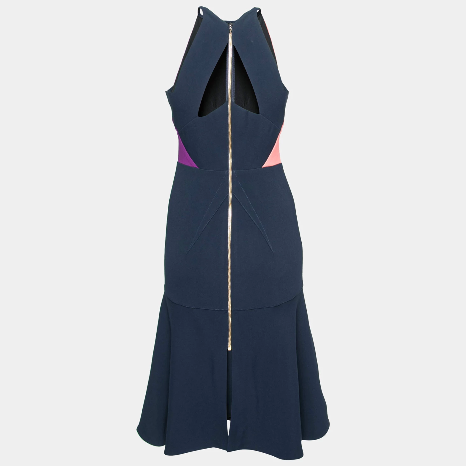 Look absolutely chic and colorful as you don this gorgeous Roland Mouret creation. Tailored using color block stretch crepe fabric, this Kennard dress displays a halter neck style. A cut-out detailing and an elongated zipper adorn the back. Make a style statement as you wear this dress.