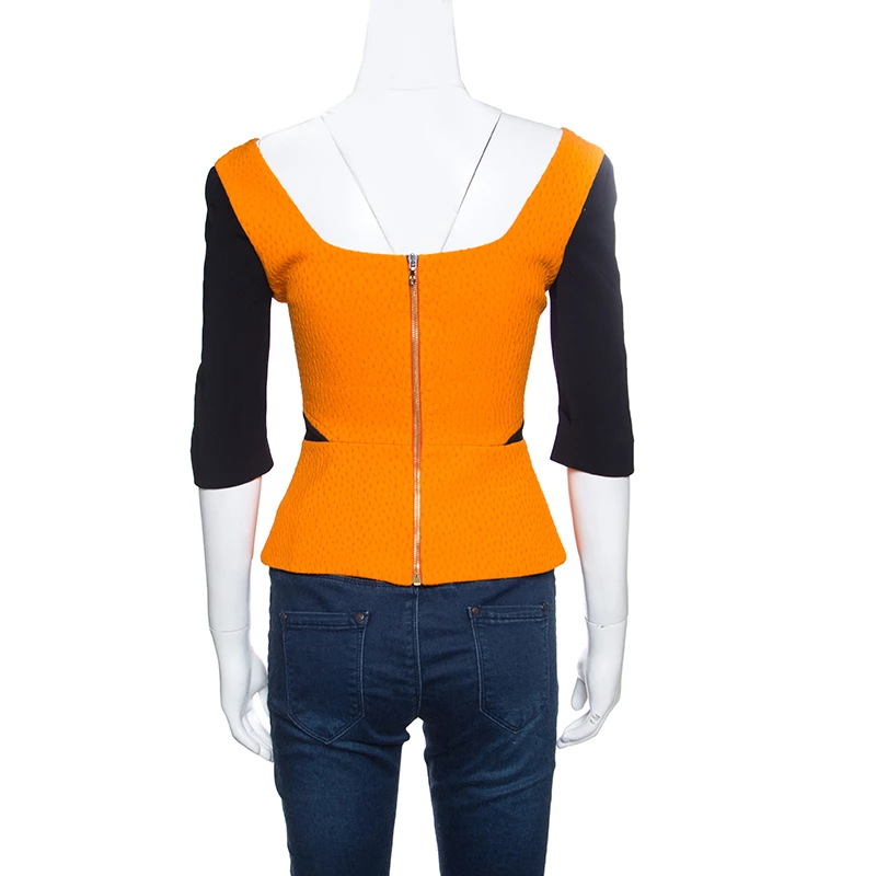 Your search for a stylish and contemporary top ends with this fabulous one from Roland Mouret. The Ajanta top is made of a blend of fabrics and features a flattering peplum silhouette. It flaunts orange and black panels that make the top look amazing and lend it an artistic design. A long zip closure at the back completes this lovely creation.